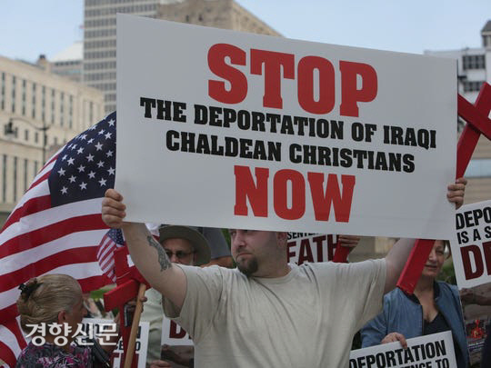 미국 시민들이 이라크 내 소수 기독교파인 칼데아 출신의 강제추방을 반대하는 시위를 벌이고 있다. / USA투데이 웹사이트 캡처