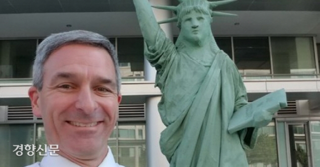 미국 이민당국 책임자인 켄 쿠치넬리 시민이민국(CIS) 국장대행이 지난 8월 15일 워싱턴 국토안보부 본부에 있는 ‘자유의 여신상’ 모형을 배경으로 웃으며 셀카를 찍고 있다. 쿠치넬리 국장대행은 셀카를 찍은 뒤 자유의 여신상 모형을 없앴다. 쿠치넬리 트위터