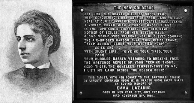 에마 래저러스와 자유의 여신상 받침대 동판에 쓰인 그의 시 ‘새로운 거상’. 위키피디아
