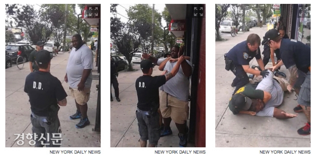 흑인 에릭 가너가 2014년 7월 17일 오후 미국 뉴욕경찰국(NYPD) 소속 사복경찰 2명에 의해 체포되는 과정. 대화를 하던 중 더스틴 다미코가 수갑을 꺼내자 뒤에 있던 대니얼 팬털레오가 금지된 목조르기 수법을 동원해 가너를 제압하고 있다. / 뉴욕데일리뉴스 웹사이트 캡처