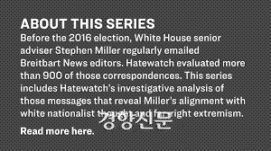 밀러의 e메일을 분석한 헤이트워치도 “밀러가 트럼프 행정부의 이민정책 설계자로서 만든 밀입국 이민자에 대한 체포 쿼터 설정, 무슬림국가 시민의 입국금지 행정명령, 불법이민자 가족분리 수용 같은 정책들을 뒷받침하는 극단주의적 반이민 이데올로기를 보여준다”고 밝혔다. e메일의 80% 이상이 인종이나 이민과 관련된 내용이다.