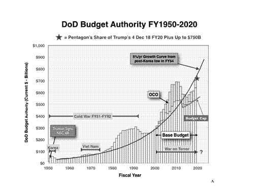 수도꼭지가 열린 것처럼 급증하게 된 국방예산을 포함한 국가안보 예산은 2019년에 1조2542억 달러에 달한다. 비영리단체인 정부감시프로젝트(POGO)가 전비와 전쟁 준비 비용, 전쟁의 결과에 따른 비용을 합해 지난 5월 내놓은 추산치다.