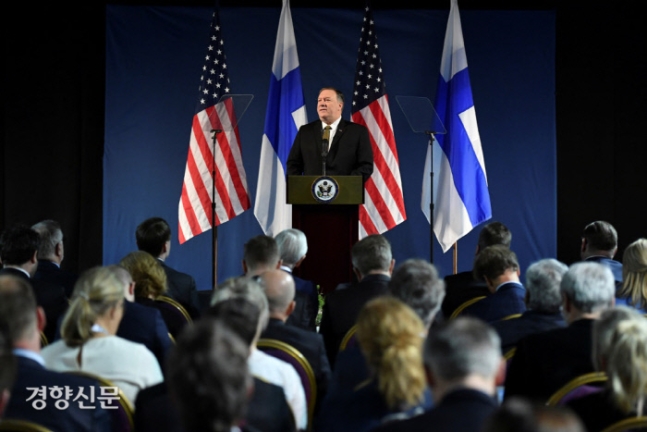 마이크 폼페이오 미국 국무장관이 지난 5월 6일(현지시간) 핀란드 로바니에미의 라피 아레나에서 열린 북극이사회 각료회의에서 연설을 하고 있다. 폼페이오는 이 연설에서 미국의 북극 개발에 대한 선점 야욕을 드러냈다. / 로이터연합뉴스