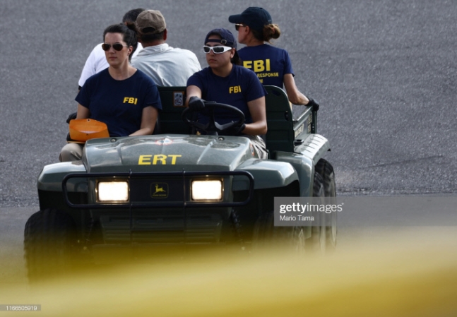 미국 연방수사국(FBI) 요원들이 지난 8월 3일(현지시간) 백인우월주의자의 총격으로 22명이 사망한 사건 현장인 미국 텍사스주 엘파소의 한 월마트 주차장에서 수사를 위해 차로 이동하고 있다. FBI가 정보원을 포섭해 극우단체를 사찰했다는 지난 10월 20일(현지시간) <인터셉트> 보도에 따라 인종주의나 극우주의 등 이데올로기에 기반해 조사를 하지 않는다는 FBI의 주장은 거짓으로 드러났다. / AFP연합뉴스