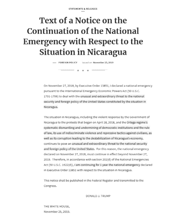 미 독립 온라인 매체 <더 그레이존>은 트럼프의 행정명령이 버락 오바마 대통령이 2015년 베네수엘라를 국가안보에 위협이 된다는 이유로 발동한 행정명령과 비슷하다고 지적했다. 실제로 미 대통령의 행정명령은 경제제재 부과를 정당화하기 위한 수단이었다. ‘미국의 소리(VOA)’ 방송은 트럼프의 행정명령 연장이 더 많은 경제 공격을 수반할 것이라고 보도했다. 카를로스 트루히요 미주기구(OAS) 주재 미국대사는 이 방송에 “니카라과에 대한 압박이 계속될 것”이라며 트럼프가 몇 주 안에 새로운 경제제재를 발표할 것이라고 말했다.