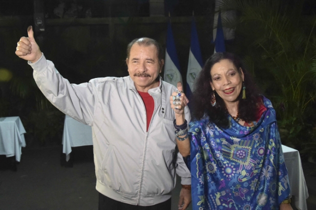 다니엘 오르테가 니카라과 대통령(왼쪽)이 2016년 11월 6일(현지시간) 치러진 대통령 선거에서 부인이자 러닝메이트인 로사리오 무리요와 함께 투표를 마친 뒤 인사를 하고 있다. 에보 모랄레스 볼리비아 대통령이 지난 11월 10일 미국이 지원한 쿠데타로 축출되면서 오르테가는 다음 축출 대상에 올랐다. 경향신문 자료사진