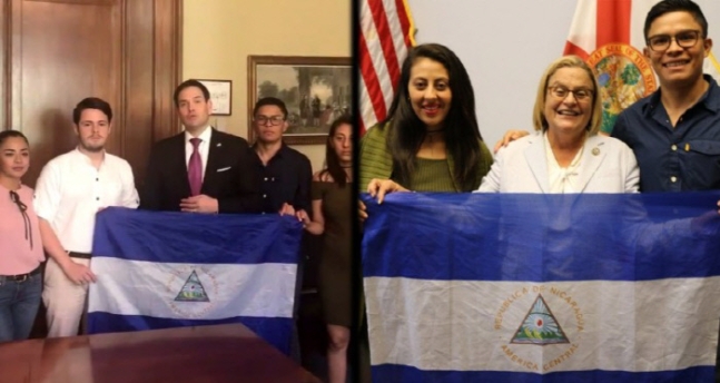 지난해 니카라과 반정부 시위의 대학생 지도자들이 그해 6월 미국 워싱턴을 방문해 마르코 루비오 상원의원(왼쪽 사진 가운데)과 일리나 로스-레티넨 하원의원(오른쪽 사진 가운데)을 만나고 있다. <더 그레이존> 웹사이트 캡처
